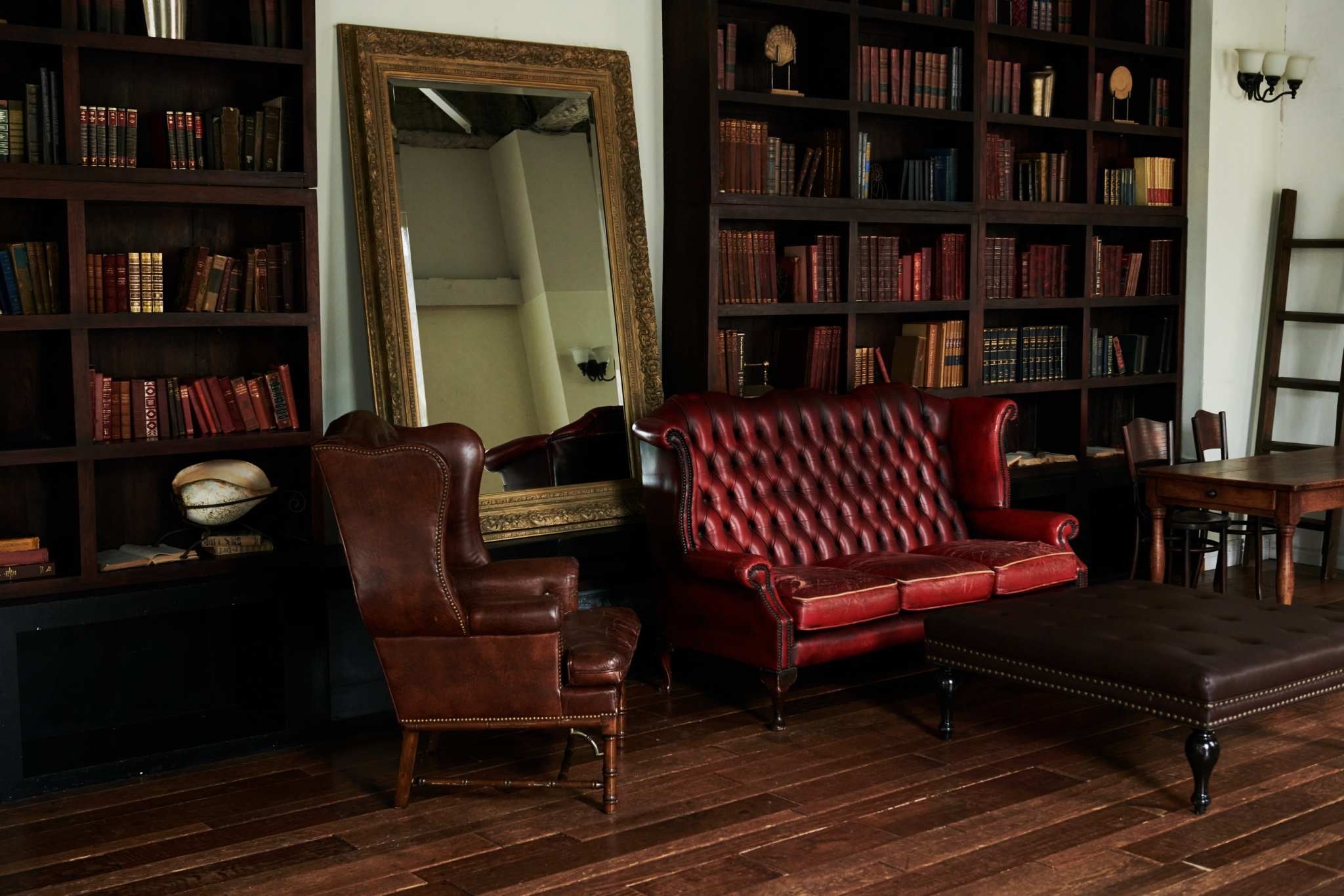 大きな本棚にたくさんの古書が並んだシックなシチュエーションです。